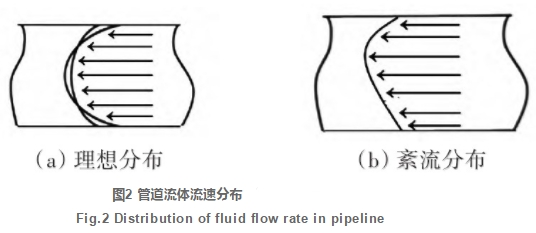 (2)在圓形管道中流體充分發(fā)展后,管道中間的流速比較均勻,但是管壁處流速梯度較大。圖2(a)為理想流速分布,當雷諾數(shù)較小時弧度較大,對應流速差別也大。但由于現(xiàn)場管道安裝復雜(例如有大量彎管、閥門等),實際流速分布如圖2(b)所示。若流速越低,則不同位置流速差異越速同時伴隨著素流或渦流產(chǎn)生,所以在實際應用中管道內(nèi)平均流速很難準確測得。