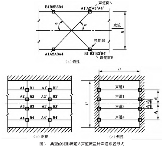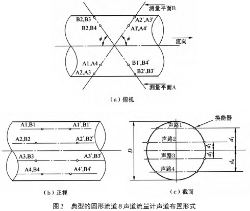 超聲波流量計是在上述原理的基礎(chǔ)上,在流道內(nèi)按照--定的規(guī)則設(shè)置多條聲道,將各條聲道測得的流道軸向線平均流速采用相應(yīng)的積分方法進(jìn)行積分計算,從而得到流道內(nèi)流體的總流量。這種時差式超聲波流量計方案,能夠利用常年“暢流期”條件,有利于泵站水量計算,避免了人為選擇推流計算參數(shù)而引起較大誤差的問題。