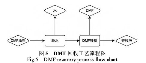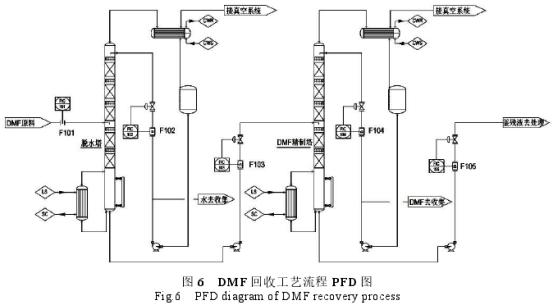 DMF回收工藝過程為: DMF原料進入脫水塔,塔頂脫除.水分,塔釜采出水分合格的DMF至DMF精制塔,DMF精制塔塔頂采出合格的DMF,塔釜排出少量廢液去處理,工藝流程見圖5。