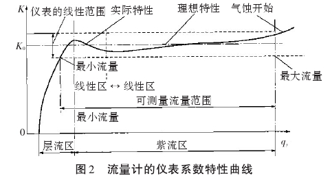 儀表常數(shù)特性曲線如圖2所示。從圖2可以看出,儀表常數(shù)的線性范圍與標(biāo)定系數(shù)K。的關(guān)系直接影響著流量計的精度。