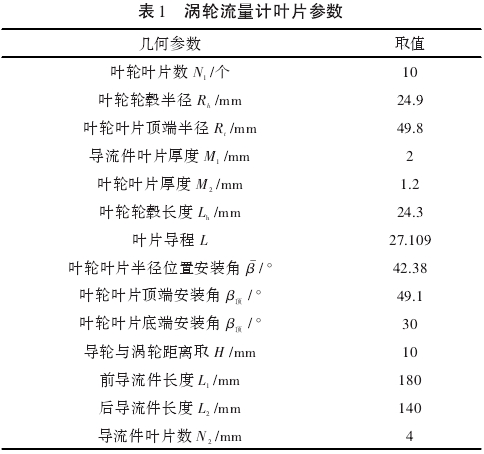 渦輪流量計口徑大小不同,葉片數(shù)量也應(yīng)不同。小口徑的流量計(D≤100mm),葉輪葉片數(shù)量通常為3~8片;大口徑的流量計(D>100mm;),葉輪葉片數(shù)則通常為10片以上5。根據(jù)流量計設(shè)計準(zhǔn)則得出的參數(shù)如表1所示。