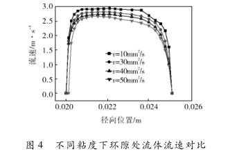 從圖4可以看出,環(huán)隙處流體的速度隨著粘度的增大而減小。原因是同一刻度流量下,環(huán)隙的面積是相同的,而流體介質的粘度增大,則其內.部摩擦力消耗增大,使流過環(huán)隙處的速度降低。