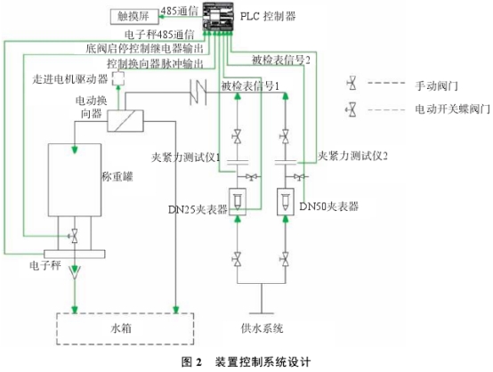 金屬管浮子流量計裝置控制部分主要包括夾緊力控制系統、換向器控制系統和稱重控制系統(圖2),獲取電子稱讀數、控制夾表器、控制換向器動作、控制底閥開關、脈沖計數等由計算機完成。在夾緊力控制系統的設計,上,考慮到被檢浮子流量計容易損壞,在每個夾表器.上安裝夾緊力傳感器(夾緊力測試儀1和夾緊力測試儀2)。當夾緊力過大時,由計算機進行夾緊力超限報警,提示操作人員停止夾緊動作;換向器控制系統中,換向器是液體流量裝置的重要組成部分,其不確定度大小對裝置整體合成不確定度有較大影響1011)影響換向器精度的主要因素是實際注水時間和觸發光電信號所產生時間之間的誤差凹本裝置采用步進電機驅動分水器換向,由PLC發送脈沖控制電機轉速、加速度和轉動角度。通過PLC的高速脈沖輸出通道,向換向器的步進電機驅動器按照勻加速-定速勻減速的方式發送脈沖,換向器電機帶著換向器導流體進行加速-勻速-減速的運行。精確控制換向器運動,保證裝置不確定度水平;稱重控制系統中,裝置主標準器高精度電子秤通過485通信模式,將傳感器讀數傳輸至PLC控制器,實現實時數據采集。