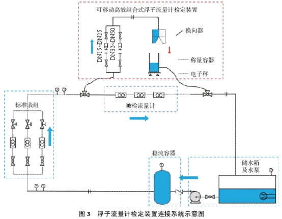 金屬管浮子流量計檢定裝置和液體流量裝置連接后的系統示意圖如圖3,組合裝置由儲水系統、水源循環穩壓系統、變頻調速系統、裝夾表系統、水流換向系統、計算機控制系統、標準器和儀表檢定管線系統組成。在水流量裝置管段前后安裝三通閥和預留旁路,通過控制三通閥實現水流在試驗管路和旁路之間的切換,三通閥的一端分別通過軟管與可移動浮子流量計檢定裝置的人、出口相連,形成浮子流量計檢定回路。浮子流量計檢定裝置和液體流量裝置連接成高效組合裝置,將水平流場轉換成適合浮子流量計檢定的垂直流場。